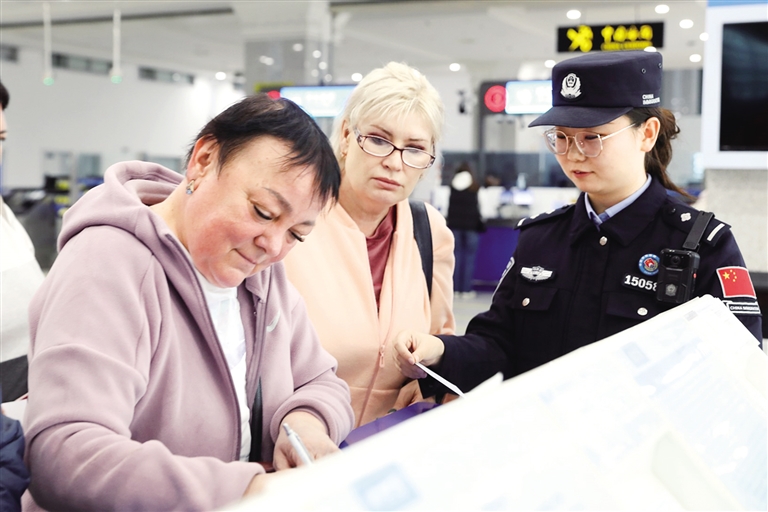 9月15日,滿洲里出入境邊防檢查站民警指導(dǎo)俄籍旅客填寫入境卡片。