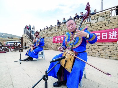 在內(nèi)蒙古自治區(qū)呼和浩特市清水河縣老牛灣村,身穿民族服裝的工作人員在演奏民族樂(lè)器。新華社發(fā)