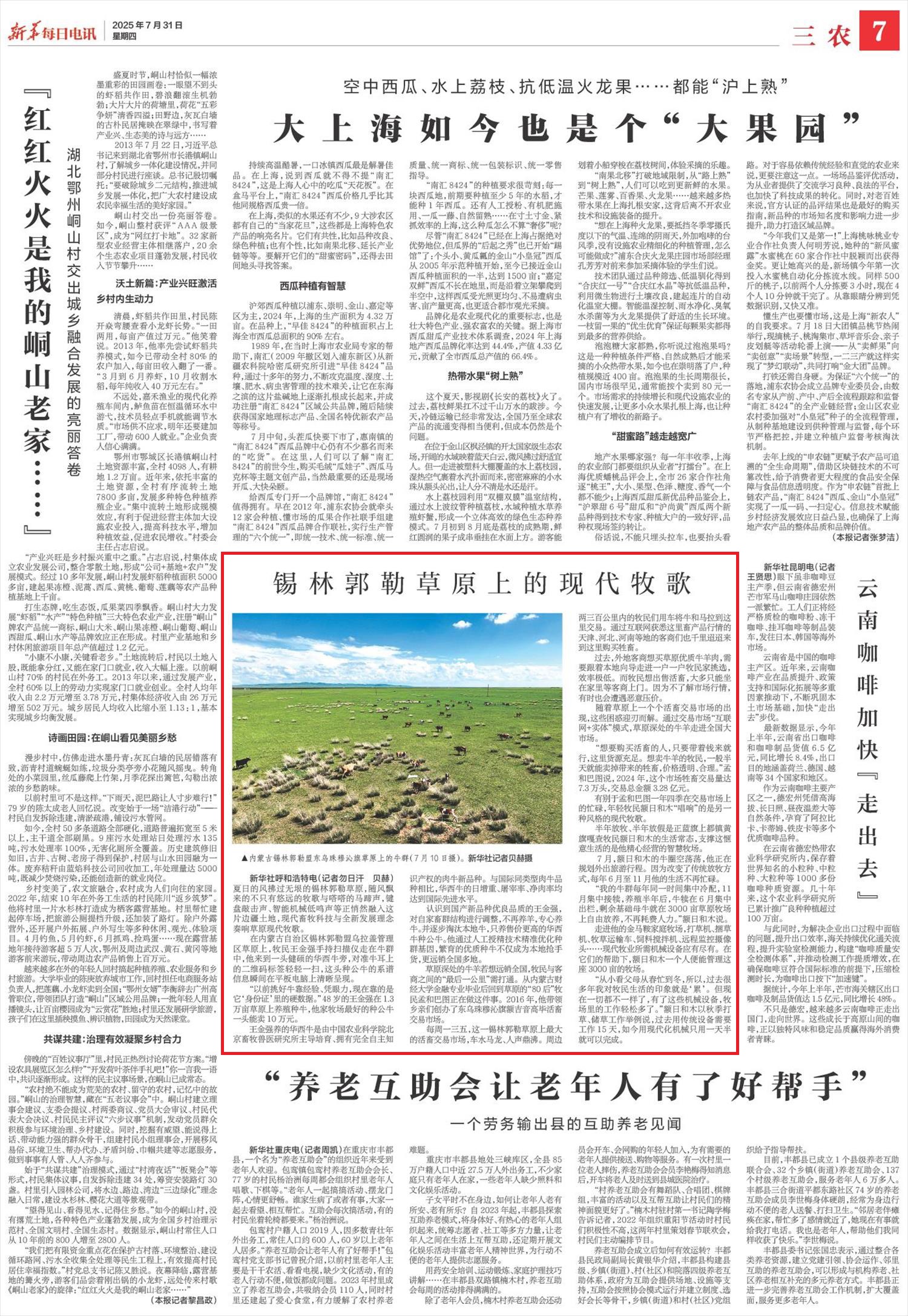2025年7月31日,《新華每日電訊》第7版刊發(fā)題為《錫林郭勒草原上的現(xiàn)代牧歌》的文章,報(bào)道了夏日的風(fēng)拂過無垠的錫林郭勒草原,隨風(fēng)飄來的不只有悠遠(yuǎn)的牧歌與嗒嗒的馬蹄聲,鍵盤敲擊聲、智能機(jī)械低鳴聲等正悄然融入這片邊疆土地,現(xiàn)代畜牧科技與全新發(fā)展理念奏響草原現(xiàn)代牧歌。