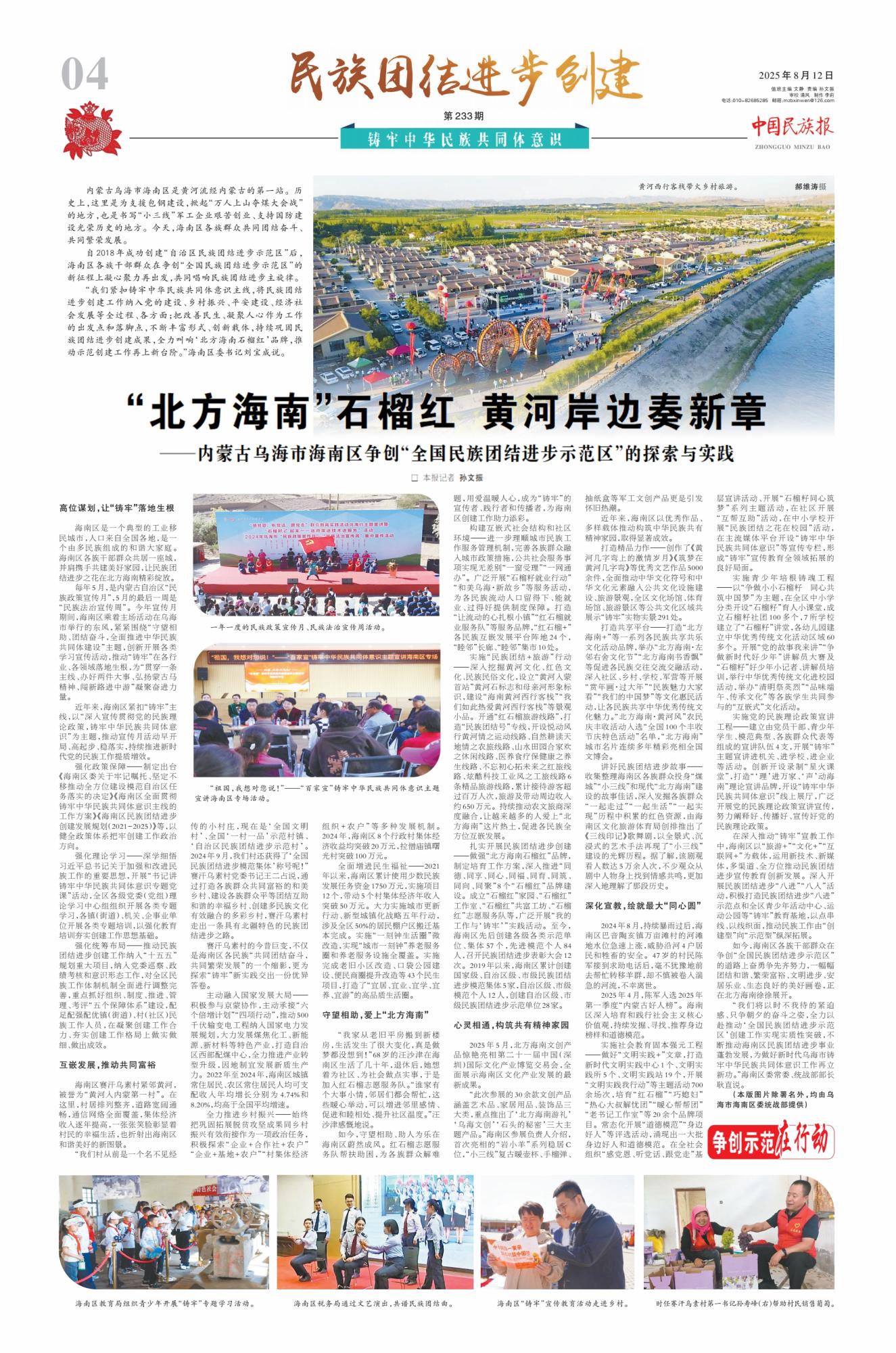 2025年8月12日,《中國(guó)民族報(bào)》第4版刊發(fā)整版文章《“北方海南”石榴紅 黃河岸邊奏新章——內(nèi)蒙古烏海市海南區(qū)爭(zhēng)創(chuàng)“全國(guó)民族團(tuán)結(jié)進(jìn)步示范區(qū)”的探索與實(shí)踐》,報(bào)道了自2018年成功創(chuàng)建“自治區(qū)民族團(tuán)結(jié)進(jìn)步示范區(qū)”后,內(nèi)蒙古烏海市海南區(qū)各族干部群眾在爭(zhēng)創(chuàng)“全國(guó)民族團(tuán)結(jié)進(jìn)步示范區(qū)”的新征程上凝心聚力再出發(fā),共同唱響民族團(tuán)結(jié)進(jìn)步主旋律。