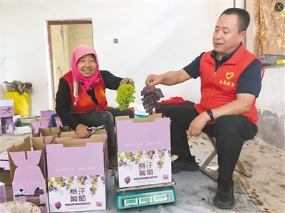 時(shí)任賽汗烏素村第一書(shū)記孫壽峰(右)幫助村民銷售葡萄。