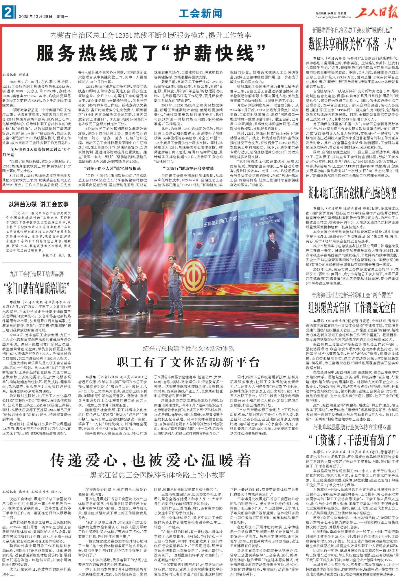 2025年12月29日,《工人日?qǐng)?bào)》第2版刊發(fā)題為《服務(wù)熱線成了“護(hù)薪快線”》的文章,報(bào)道了內(nèi)蒙古自治區(qū)總工會(huì)12351熱線開(kāi)通兩年以來(lái),傾聽(tīng)職工心聲、化解勞動(dòng)糾紛,成為維護(hù)職工合法權(quán)益的“暖心橋”和“維權(quán)盾”。其中,熱線共受理零散農(nóng)民工欠薪投訴738起,為上千名農(nóng)民工追回欠薪。