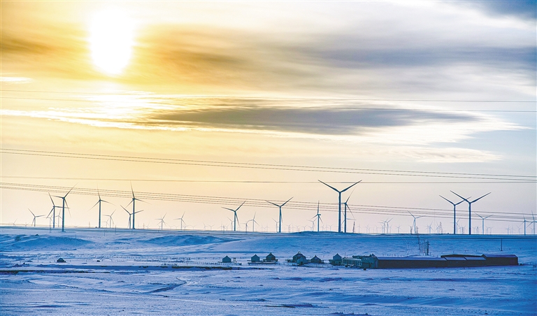 湛藍(lán)天幕之下,150座白色風(fēng)車如鋼鐵巨人般巍然矗立,巨大的風(fēng)機(jī)葉片迎風(fēng)轉(zhuǎn)動(dòng),劃破長(zhǎng)風(fēng),發(fā)出低沉而均勻的呼嘯,與天地間的遼闊寂靜共鳴。