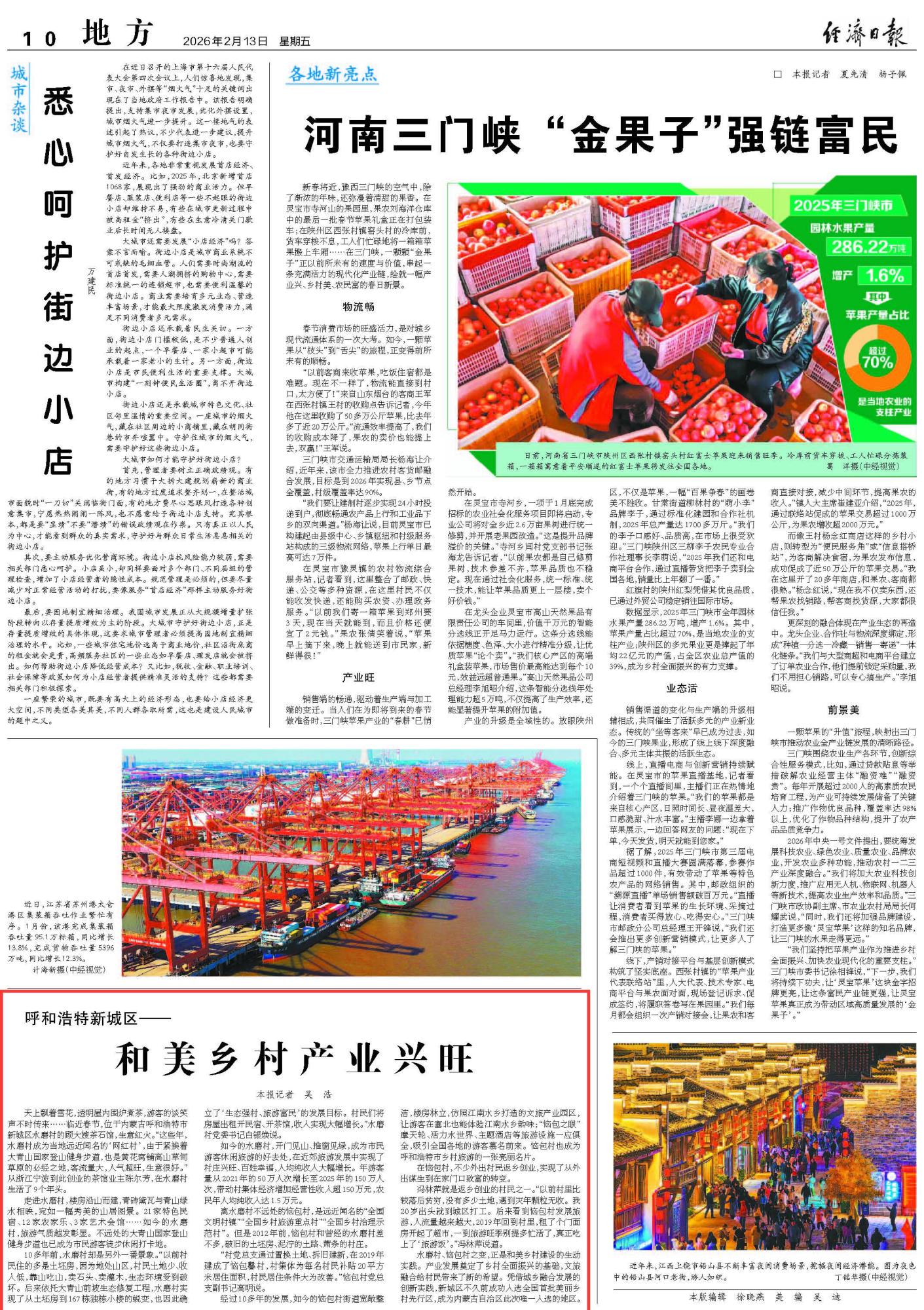 2026年2月13日《經(jīng)濟日報》第10版刊發(fā)了《呼和浩特新城區(qū)——和美鄉(xiāng)村產(chǎn)業(yè)興旺》的文章,報道了內(nèi)蒙古呼和浩特市新城區(qū)水磨村、惱包村之變,是和美鄉(xiāng)村建設的生動實踐。新城區(qū)成功入選全國首批美麗鄉(xiāng)村先行區(qū),成為內(nèi)蒙古自治區(qū)此次唯一入選的地區(qū)。產(chǎn)業(yè)發(fā)展奠定了鄉(xiāng)村全面振興的基礎,文旅融合給村民帶來了新的希望。