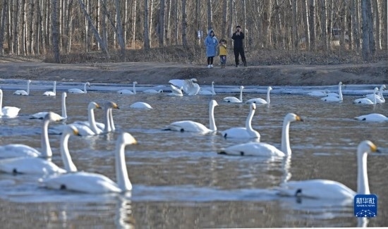 2月21日,游客在北票市八家子鄉(xiāng)紅村大凌河畔觀賞天鵝。