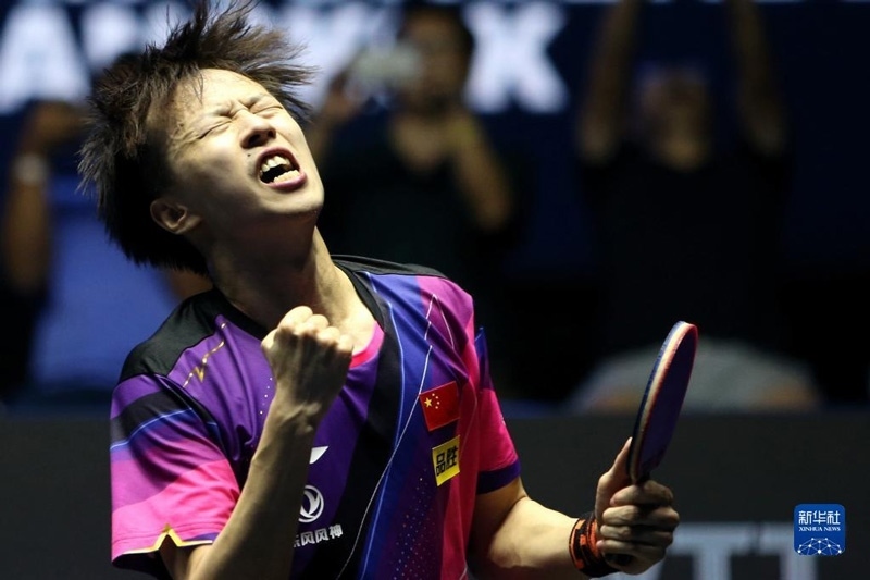 2023年4月23日,中國(guó)選手王楚欽慶祝得分。當(dāng)日,在澳門塔石體育館舉行的2023世界乒乓球職業(yè)大聯(lián)盟(WTT)澳門冠軍賽男子單打決賽中,中國(guó)選手王楚欽以4比0戰(zhàn)勝隊(duì)友馬龍,奪得冠軍。新華社記者 張金加攝