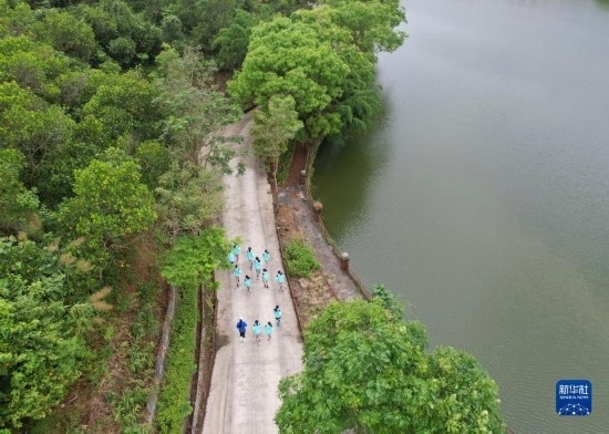 在海南瓊中縣舉辦的中國足協(xié)女足青訓(xùn)中心“希望杯”U12組比賽的空閑時段,四川隊(duì)隊(duì)員在賓館內(nèi)部道路跑步(無人機(jī)照片,4月10日攝)。
