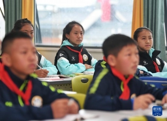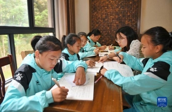 在海南瓊中縣舉辦的中國足協(xié)女足青訓(xùn)中心“希望杯”U12組比賽的空閑時段,來自涼山彝族自治州的四川隊(duì)隊(duì)員舍布么扯鳩莫(左二)和隊(duì)友們在老師帶領(lǐng)下學(xué)習(xí)文化課(4月10日攝)。