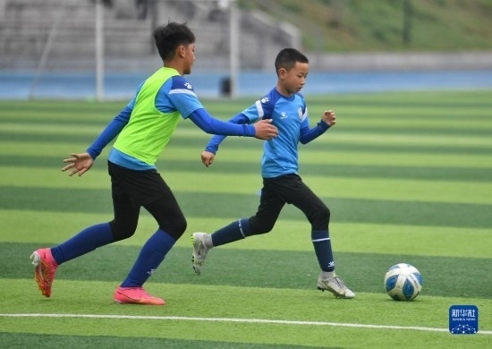 在瀘州天立春雨學(xué)校足球場,來自涼山彝族自治州的金貴坤(右)與隊(duì)友進(jìn)行訓(xùn)練(3月28日攝)。