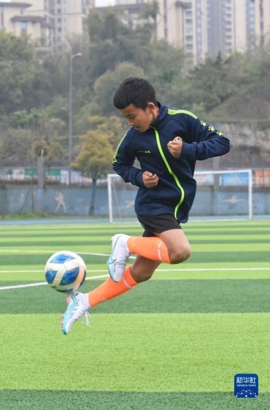 在瀘州天立春雨學(xué)校足球場,來自涼山彝族自治州的楊坤在進(jìn)行訓(xùn)練(3月29日攝)。