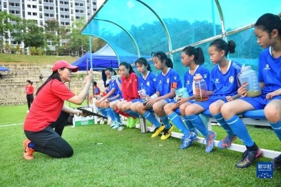 在海南瓊中縣舉辦的中國足協(xié)女足青訓(xùn)中心“希望杯”U12組比賽的空閑時段,四川隊(duì)主教練陳華(中)為隊(duì)員進(jìn)行戰(zhàn)術(shù)指導(dǎo)(4月9日攝)。