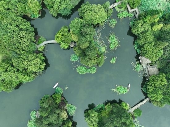 6月11日,游客在曲院風(fēng)荷景區(qū)欣賞荷花(無(wú)人機(jī)照片)。