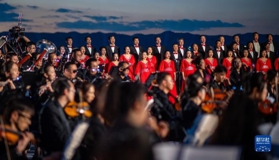 來自昆明聶耳交響樂團(tuán)及昆明市民族歌舞劇院民樂團(tuán)的演奏家們在昆明市滇池畔共同演奏包括《義勇軍進(jìn)行曲》《賣報(bào)歌》在內(nèi)的聶耳代表作(7月17日攝)。