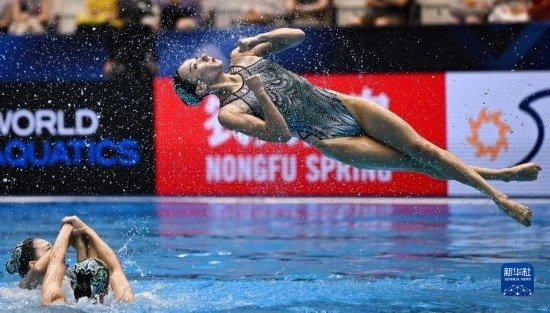 7月21日,中國隊(duì)在比賽中。當(dāng)日,在日本福岡舉行2023年世界游泳錦標(biāo)賽花樣游泳集體自由自選決賽中,中國隊(duì)以329.1687分的成績(jī)獲得冠軍。新華社記者 夏一方 攝
