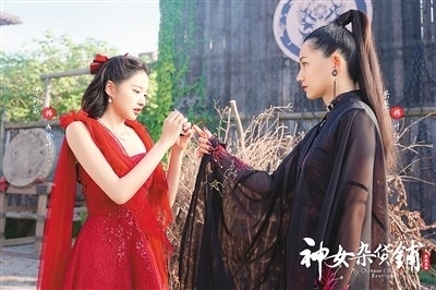 微短劇《神女雜貨鋪》中的數(shù)字人“果果”(右)與真人演員一起演戲。