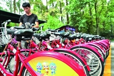 杭州共享單車上的亞運(yùn)會(huì)吉祥物圖案。本報(bào)記者陳茵攝 光明圖片