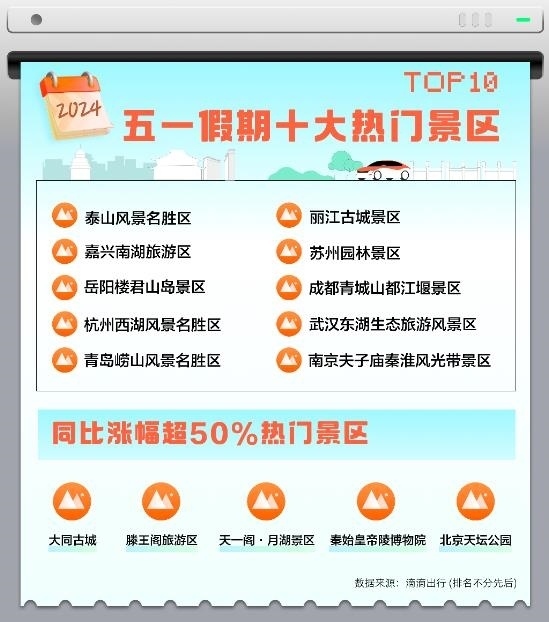 與去年五一相比,大同古城、滕王閣旅游區(qū)、天一閣·月湖景區(qū)、秦始皇帝陵博物院、北京天壇公園等景區(qū)今年打車(chē)需求火熱,同比上漲均超過(guò)50%,其中大同古城的打車(chē)需求同比漲幅為114%。