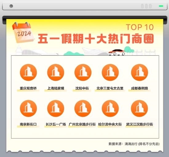 承載了“逛吃玩”需求一體的大型商圈也是五一出行的熱門(mén)。假期前往大型商圈的用車(chē)需求環(huán)比上漲118%。從打車(chē)需求來(lái)看,重慶觀音橋、上海陸家嘴、沈陽(yáng)中街等成為今年五一十大熱門(mén)商圈。其中前往重慶觀音橋、長(zhǎng)沙五一廣場(chǎng)的用車(chē)需求同比上漲均超50%。
