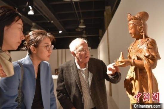 當(dāng)?shù)貢r(shí)間8月12日,巴西圣保羅州坎皮納斯市,“中國藝術(shù)五千年 塞奎拉·萊特收藏”啟幕。圖為巴西文物修復(fù)師毛羅·里貝羅(右一)講解如何修復(fù)木雕觀音像。中新社記者 林春茵 攝