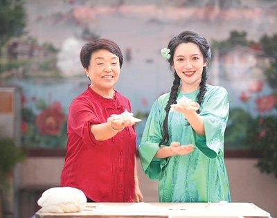 柳青瑤(右)身穿綠色老軟緞改良旗袍與煙臺市膠東花餑餑非遺傳承人曲麗榮錄制電視節(jié)目。本文配圖除標注外均為受訪者供圖