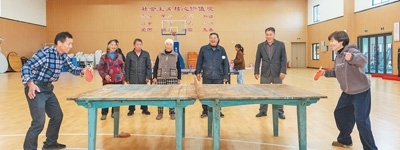 在浙江省江山市鳳林鎮(zhèn)白沙村體育館內(nèi),4張乒乓球桌一字排開,村民兩兩對陣,“乒乒乓乓”的擊球聲不絕于耳。一旁,一張木制乒乓球桌格外顯眼,斑駁老舊,刻滿歲月的痕跡?!八任夷昙o都大,已經(jīng)44歲了?!贝迕裰芸煽筛嬖V記者。