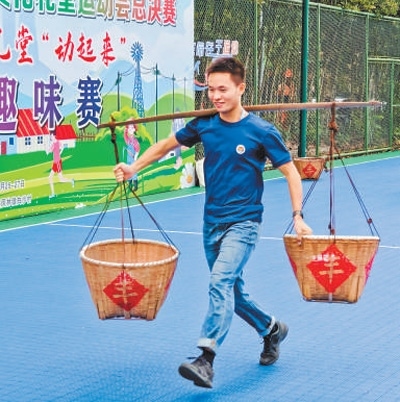 在白沙村舉辦的浙江省農(nóng)村文化禮堂運動會總決賽上,村民參與挑扁擔(dān)比賽。