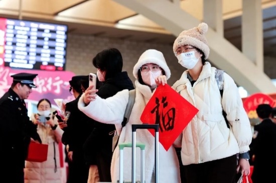 2025年鐵路春運“萬福迎春”活動現(xiàn)場,一位外籍旅客自拍留念。