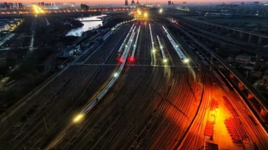除夕當天,石家莊動車運用所被金色的晨曦照亮。