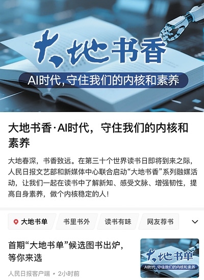 習(xí)近平總書記在今年全國(guó)兩會(huì)期間的重要講話中指出“書香是一種氛圍”“數(shù)字閱讀要和傳統(tǒng)閱讀結(jié)合起來(lái),守住我們的內(nèi)核和素養(yǎng)”。在第三十個(gè)世界讀書日即將到來(lái)之際,人民日?qǐng)?bào)社文藝部和新媒體中心聯(lián)合啟動(dòng)“大地書香”系列融媒活動(dòng),并圍繞“AI時(shí)代,守住我們的內(nèi)核和素養(yǎng)”推出首期“大地書單”。來(lái)自出版、文藝、科技、教育等不同領(lǐng)域的20位薦書人,推薦出35本候選圖書,在人民日?qǐng)?bào)客戶端“大地書香”專題予以集中呈現(xiàn),參照網(wǎng)友的評(píng)論與推薦,最終推選出10本上榜圖書。讓我們多讀書、讀好書,一起在氤氳著書香的大地上行穩(wěn)致遠(yuǎn)。