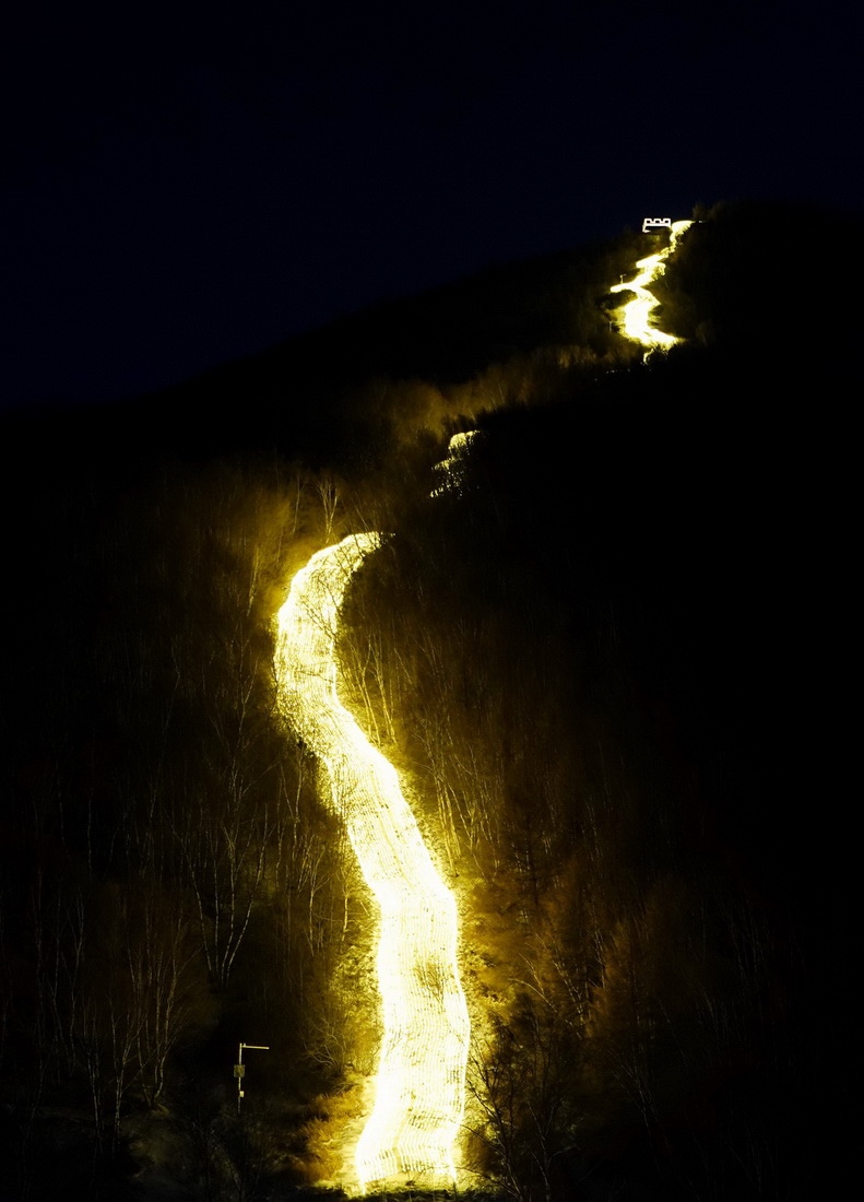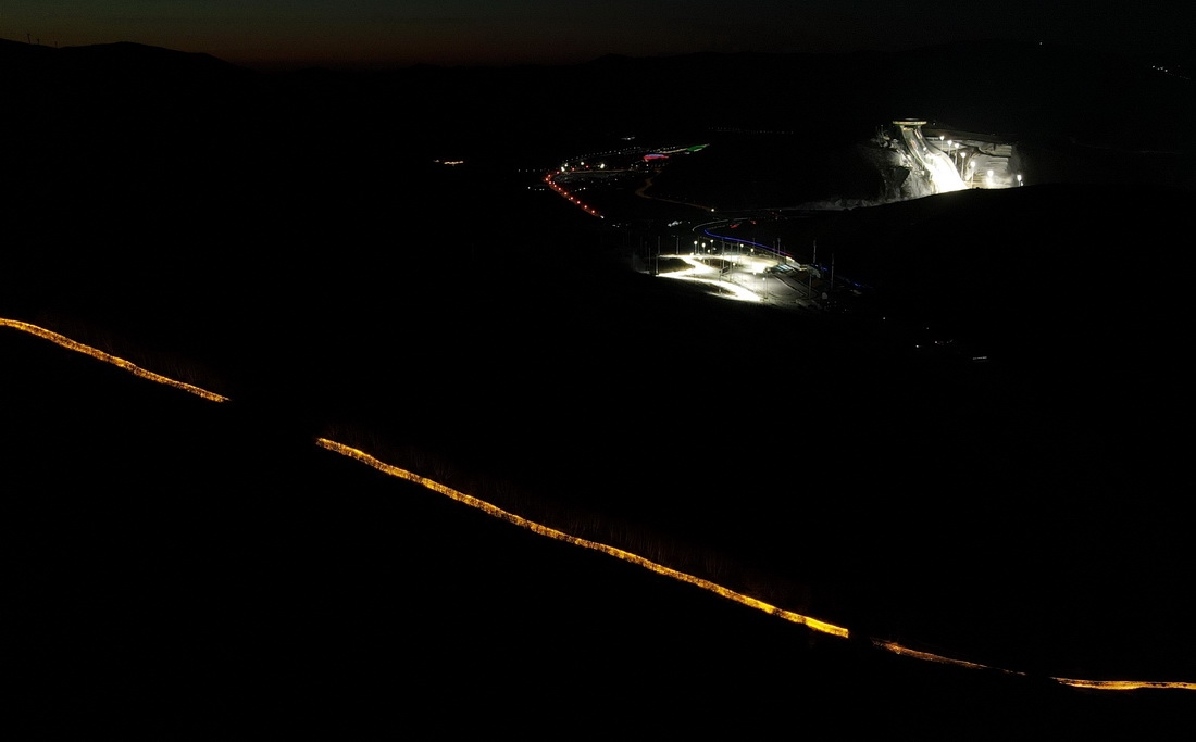 這是12月30日拍攝的崇禮長(zhǎng)城景觀展示亮化工程現(xiàn)場(chǎng),遠(yuǎn)處為國(guó)家越野滑雪中心(無(wú)人機(jī)照片)。新華社記者 牟宇 攝