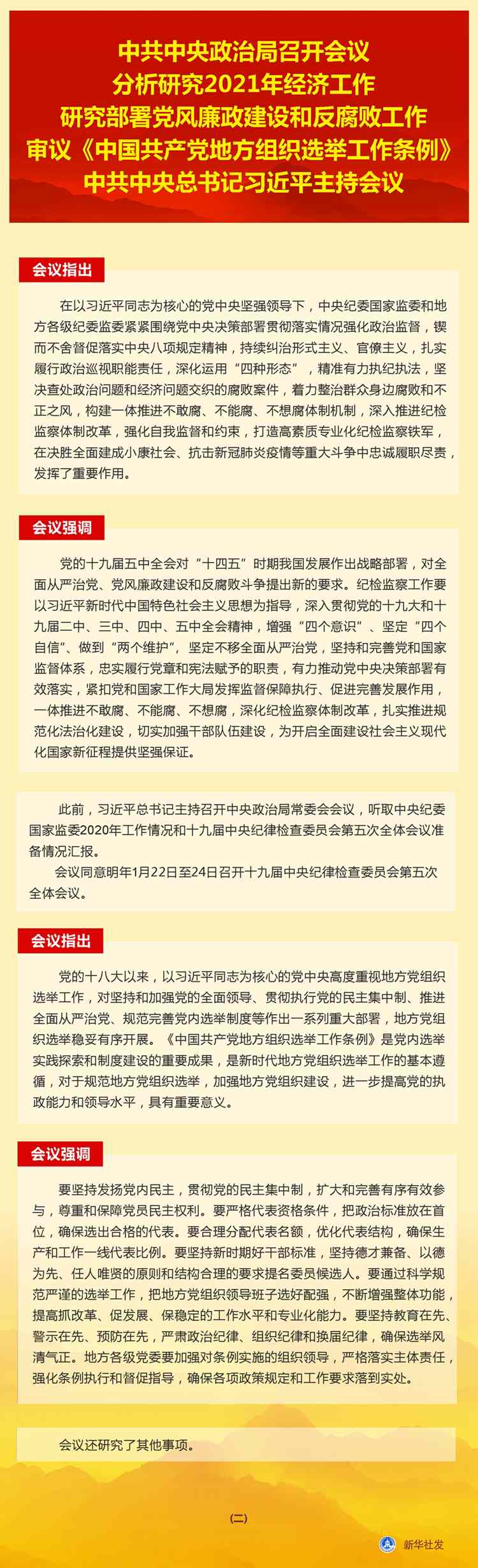 新華社北京12月11日電 中共中央政治局12月11日召開會議,分析研究2021年經(jīng)濟(jì)工作;聽取中央紀(jì)委國家監(jiān)委工作匯報,研究部署2021年黨風(fēng)廉政建設(shè)和反腐敗工作;審議《中國共產(chǎn)黨地方組織選舉工作條例》。中共中央總書記習(xí)近平主持會議。