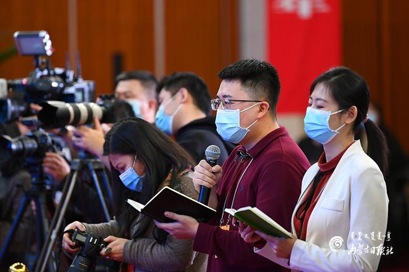 1月27日晚,自治區(qū)十三屆人大四次會議“代表通道”集中采訪活動在內(nèi)蒙古人民會堂玻璃廳舉行,8位人大代表分兩組“亮相”。這是自治區(qū)人大首次開通“代表通道”。圖為人民網(wǎng)記者在提問。內(nèi)蒙古日報記者 金泉 攝