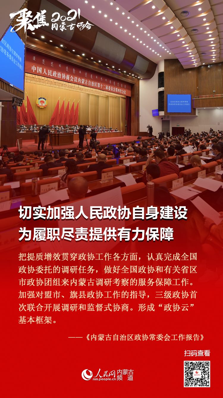 1月25日上午,自治區(qū)政協(xié)十二屆四次會(huì)議在內(nèi)蒙古人民會(huì)堂隆重開幕。自治區(qū)政協(xié)主席李秀領(lǐng)作政協(xié)內(nèi)蒙古自治區(qū)第十二屆委員會(huì)常務(wù)委員會(huì)工作報(bào)告。今年的政協(xié)常委會(huì)工作報(bào)告都有哪些亮點(diǎn),2021年主要工作安排有哪些,七張圖帶您梳理!