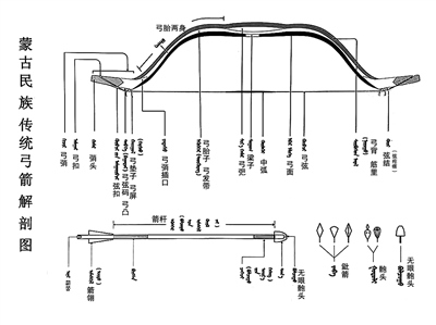 “用彈性很好的竹子或木頭作為弓胎,制作弓里的牛角一般是水牛角,或者巖羊角也可以,貼在弓外的牛筋來自春天的牛,這時(shí)候牛比較瘦,牛筋油脂少、有彈性。膠則是用魚膘、魚皮、豬皮、馬皮等熬制的膘膠,最外面還要貼一層蛇皮或者樺樹皮,防止受潮?!敝Z敏朝魯說。