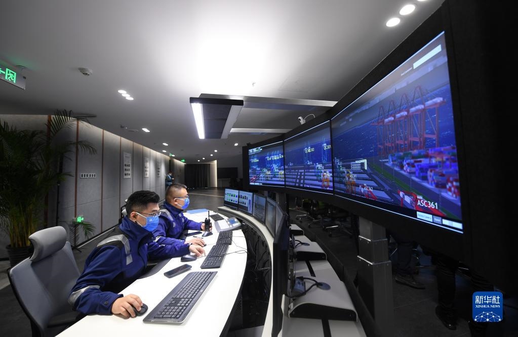 工作人員在天津港北疆港區(qū)C段智能化集裝箱碼頭智控中心內監(jiān)控碼頭作業(yè)狀態(tài)(2021年10月17日攝)。新華社記者 趙子碩 攝