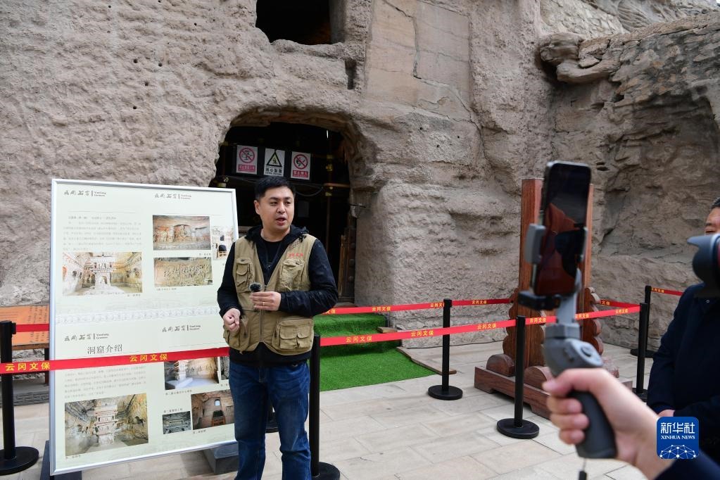 5月11日,云岡研究院工作人員孫波在云岡石窟第1窟進(jìn)行文物保護(hù)專(zhuān)題直播。新華社記者 楊晨光 攝