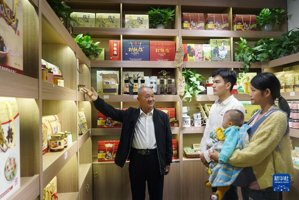 2020年10月21日,江西省贛州市于都縣梓山鎮(zhèn)潭頭村村民孫觀發(fā)(左一)向游客介紹當?shù)氐奶厣r(nóng)產(chǎn)品。 新華社記者 萬象 攝