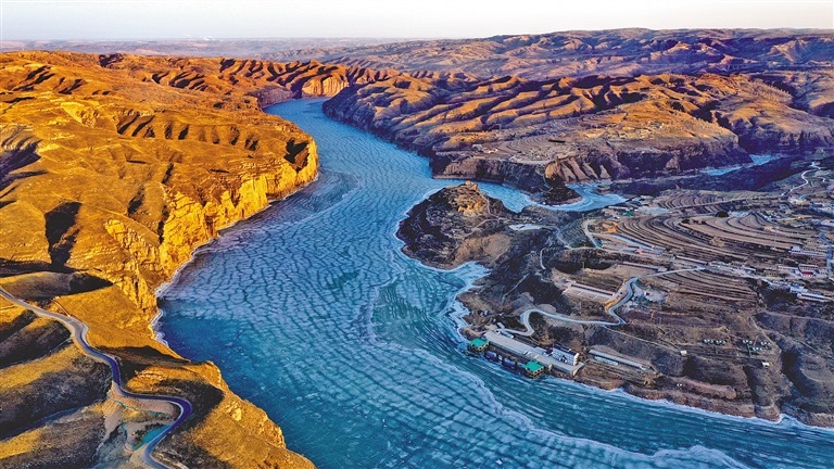 準(zhǔn)格爾黃河大峽谷,龍鱗狀的藍(lán)色冰面,猶如一條長(zhǎng)龍蜷伏于崇山峻嶺間。文/圖 徐秋利
